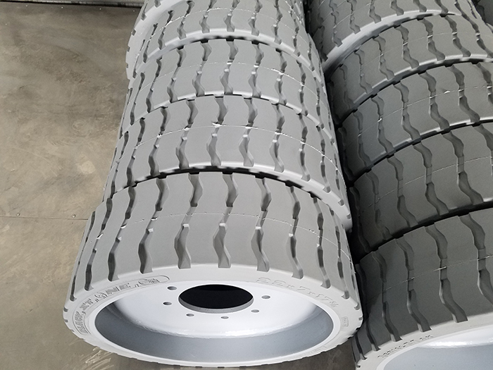 将堆高机实心轮胎平放于地面,将连接螺平口端对平内槽圆切线,然后用重锤或压力装置将螺栓全部压入螺孔中,如此一将其余Ⅱ个螺栓装上。